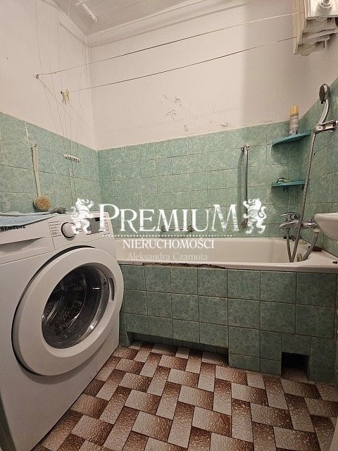Łazienka o pow ok 3 m2, na podłodze i ścianach kafelki, wanna oraz pralka.