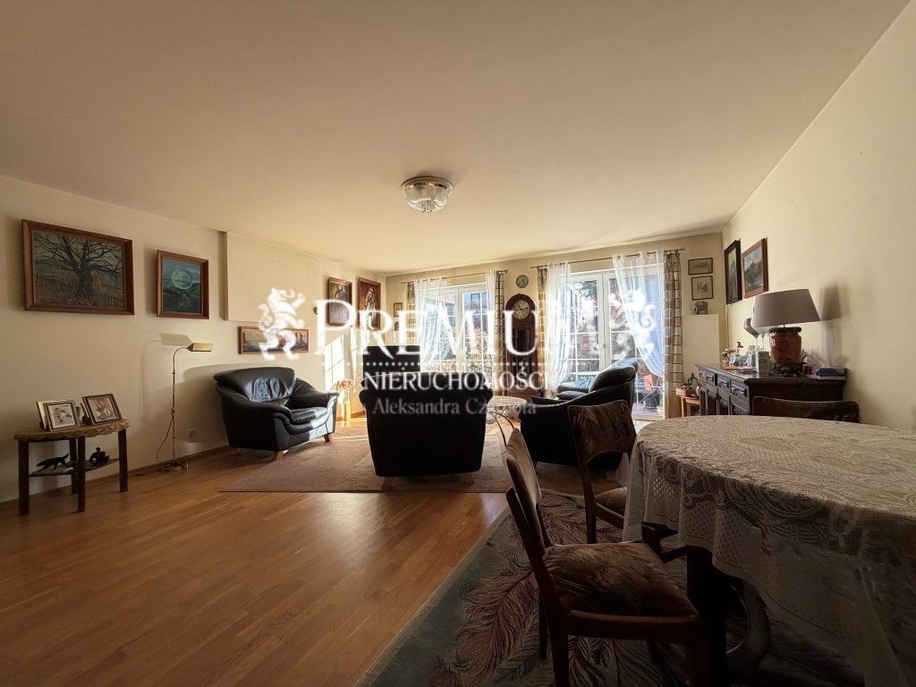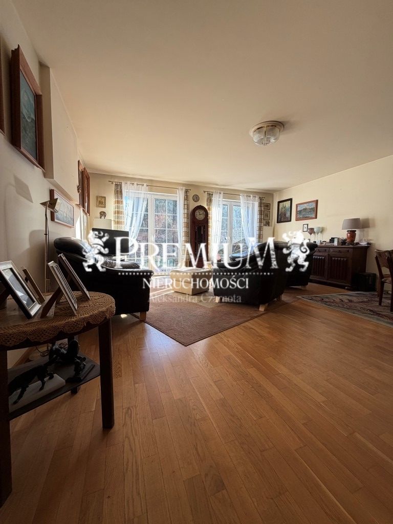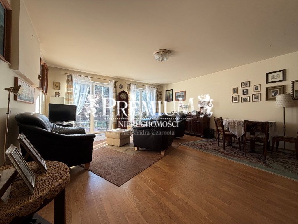 Na parterze znajduje się salon (pow. ok. 30 m2) z możliwością zainstalowania kominka, częścią jadalnianą oraz otwartą kuchnią (pow. ok. 15 m2). Na podłodze na parterze parkiet dębowy. Z salonu - wyjście na taras oraz na zagospodarowany ogród (o pow. ok. 230 m2). W ogrodzie liczne nasadzenia oraz krzewy.