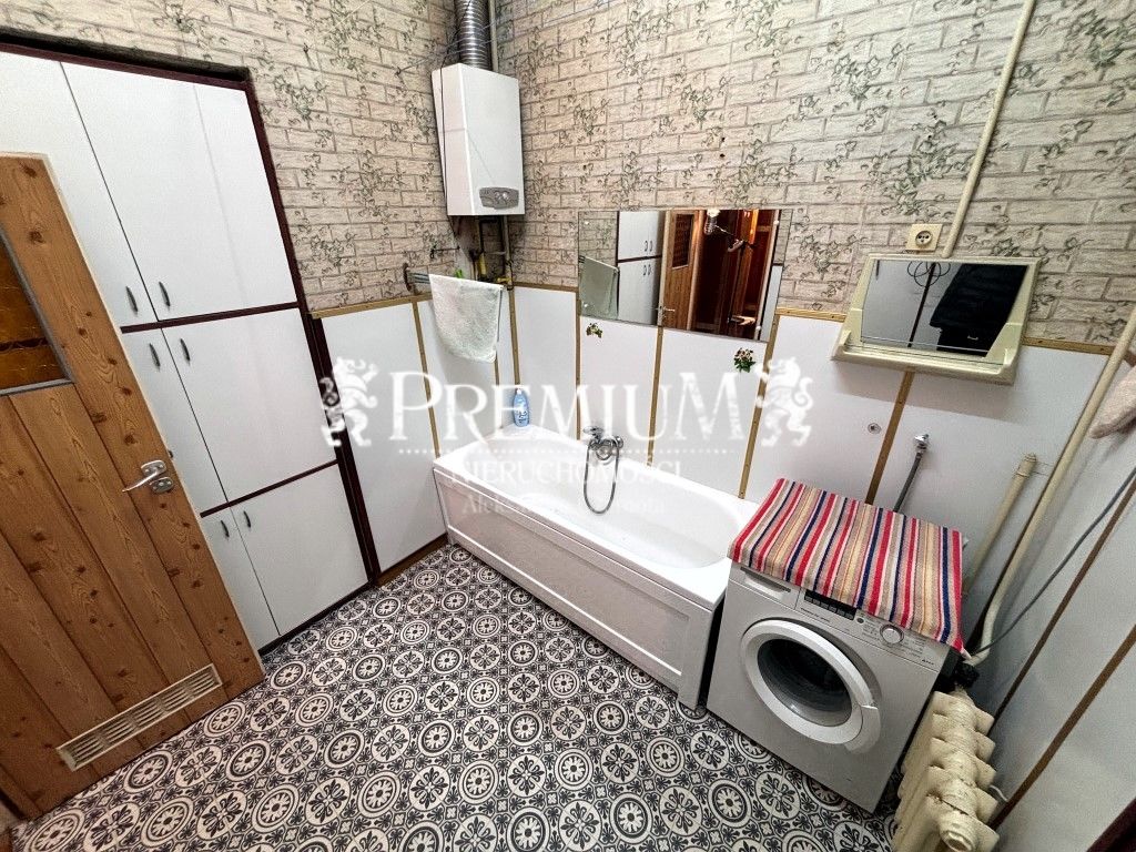 Łazienka o pow ok 6 m2 z wanną oraz pralką. Junkers do podgrzania wody gazowy.
